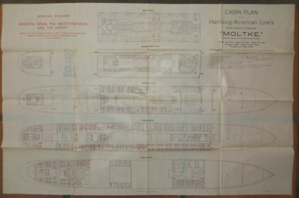 Superb tissue Cabin Deck Plan. Opens to 20×30″. Issued for her Jan 31 1907 West Indies cruise. A Gem!