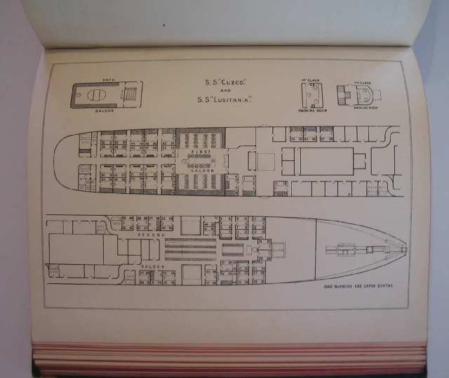Saloon Rates and Deck Plans. “Winter Cruises through to Egypt 1913-1914″. 44 page booklet. 6×8”. Contains 7 sets of Deck Plans. Full page advertises the LUSITANIA/MAURETANIA with photo of liner. Also ads with photos for FRANCONIA,LACONIA,CARONIA & CARPATHIA, IVERNIA, SAXONIA, PANNONIA. Complete fares, general information. Illustration of liner on cover. Photo of liner at Algiers.
