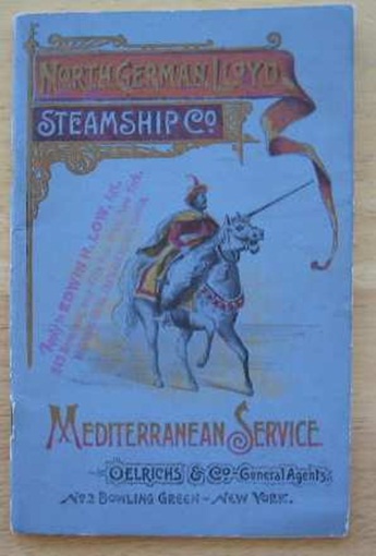 “Mediterranean Service”. Superb 40 page booklet + covers. 4.5×7″. Contains 2 exterior photos, 3 elegant interior photos. Text about the ships, officers, route, information. Photos of places to be visited. Interestingly, text notes that medical services are free to steerage passengers, but Cabin passengers are expected to pay.. Issued 1892.