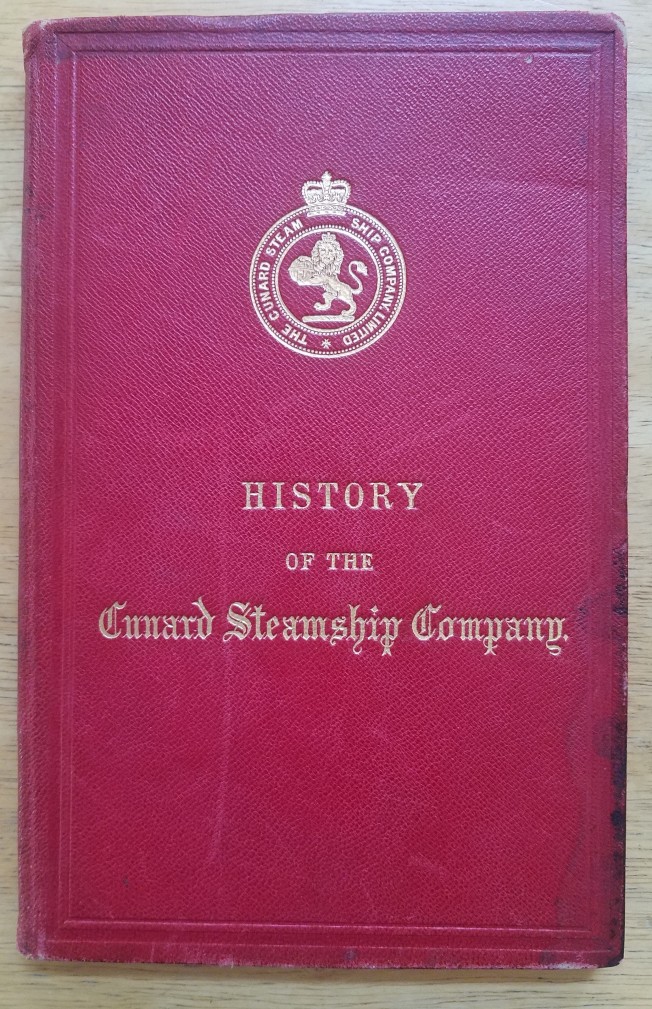 “History of the Cunard Steamship Company”. 32 page book + endpapers & red hard covers. 6.25×9.75″. 13 superb plates with illustrations of the liners. Also contains 5 fold out tissue Deck Plans for: UMBRIA / ETRURIA, OREGON, AURANIA, SERVIA, GALLIA. Comprehensive text provides a concise history of the line. Fleet list with statistics of 34 vessels listed. One plate separated from the binding, and book is complete! Title & Cunard Crest in gold on cover. EXTREMELY RARE! Issued February 1886.